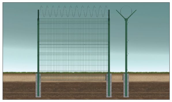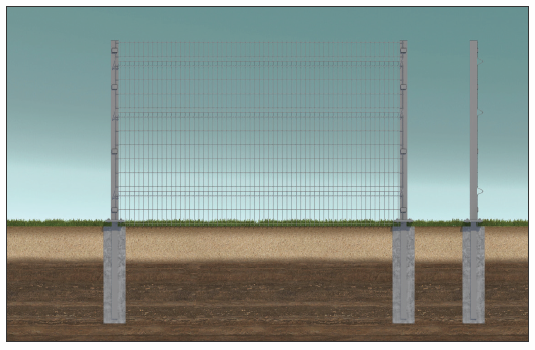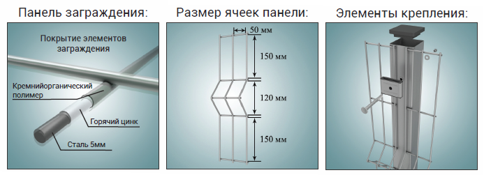 быстромонтируемое инженерное препятствие (в составе ИК ИТСО промышленных, военных, экологически опасных и других объектов) на основе стального оцинкованного прутка диаметром 5 мм с дополнительным полимерным покрытием, в котором несущую часть выполняют столбы из профильной трубы размерностью от 62х55 до 80х80, а заграждение осуществляется сборкой из секций секций (решеток) с ячейкой 50х50, 50х200, 50х150, 50х230 в зависимости от требований Заказчика. В соответствии с специальными требованиями толщина прутка может быть увеличена до 8 мм.